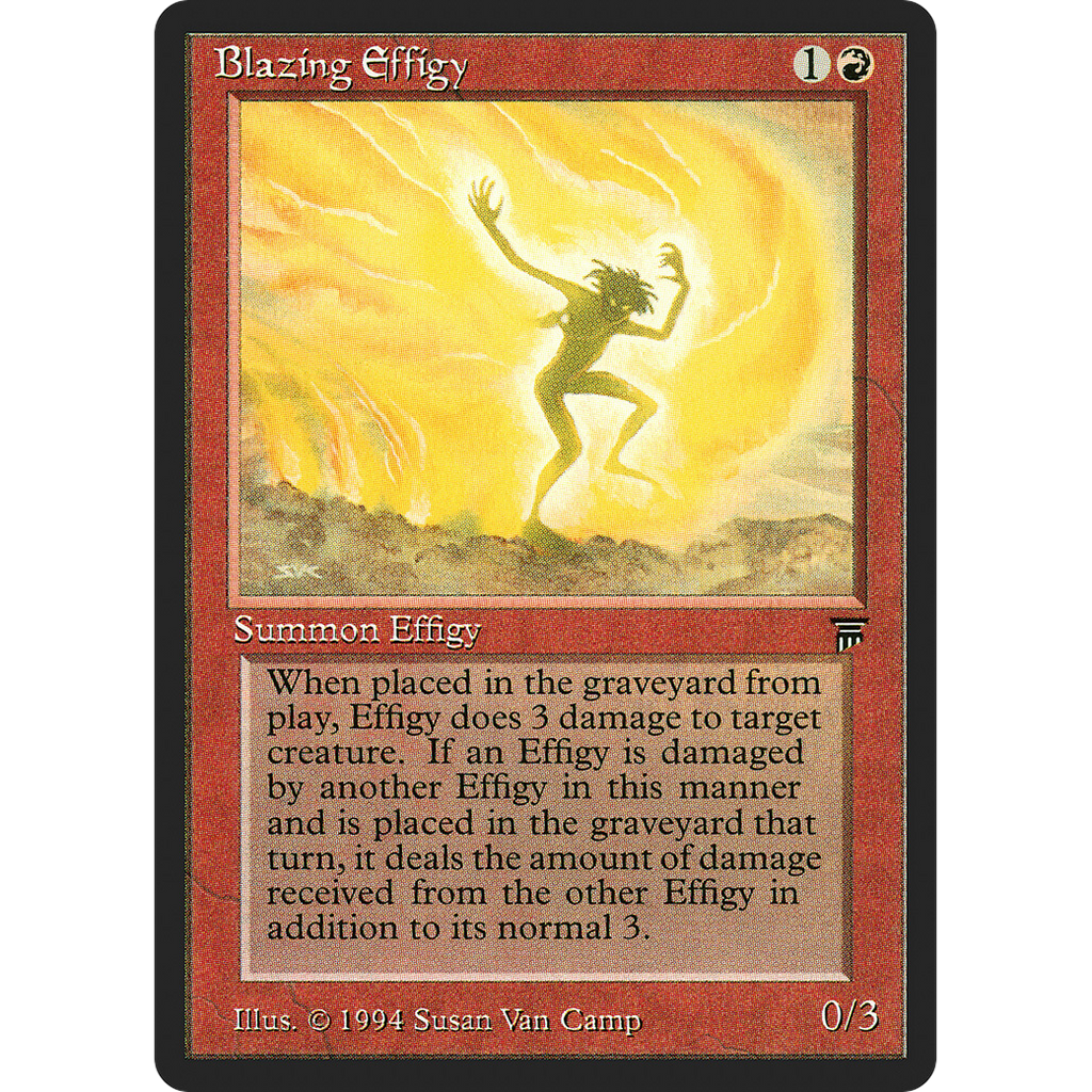 When Blazing Effigy dies, it deals X damage to target creature, where X is 3 plus the amount of damage dealt to Blazing Effigy this turn by other sources named Blazing Effigy.