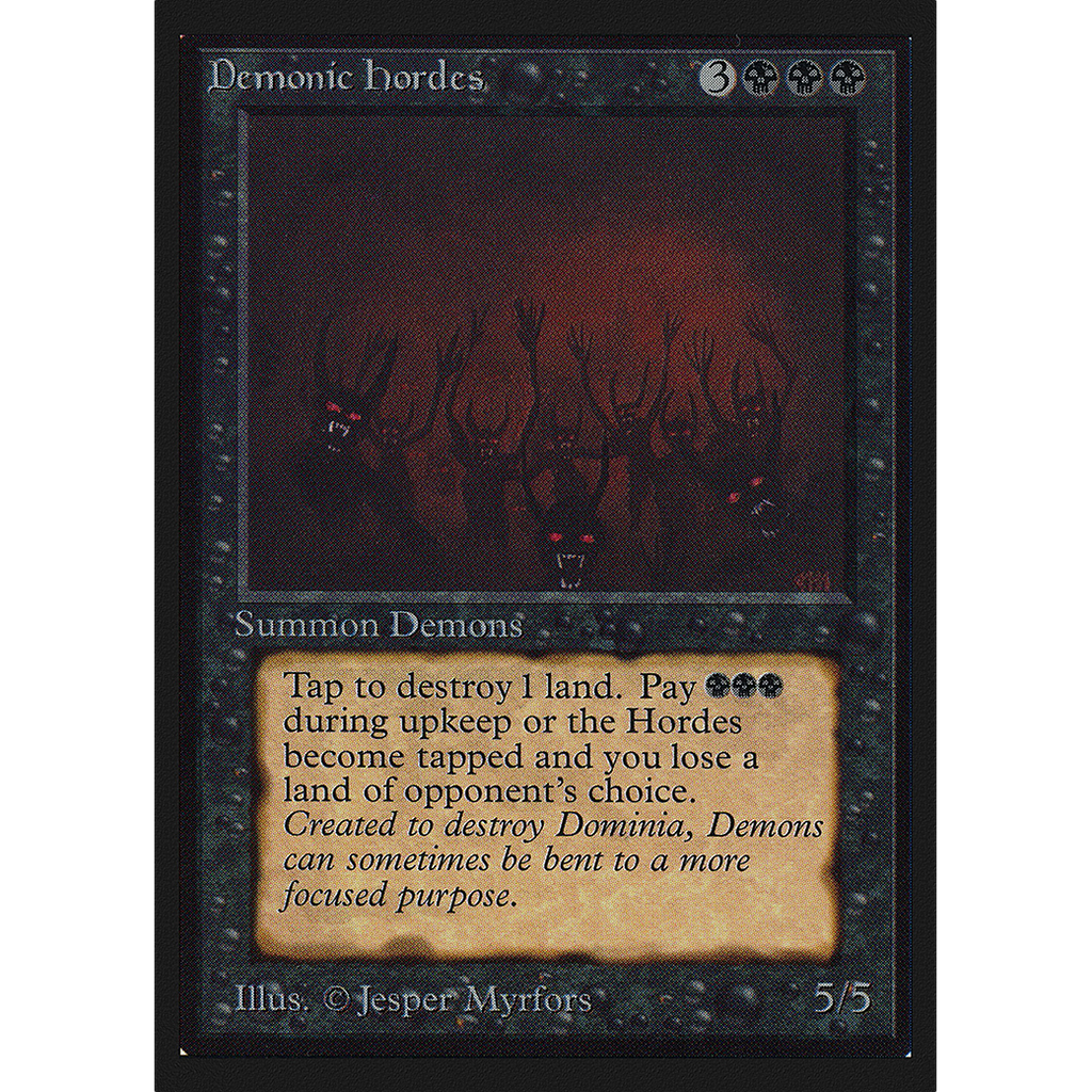 At the beginning of your upkeep, unless you pay , tap Demonic Hordes and sacrifice a land of an opponent's choice.