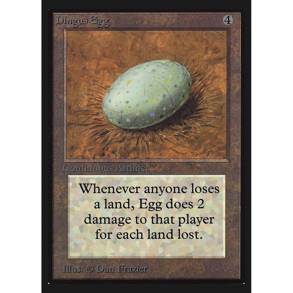 Whenever a land is put into a graveyard from the battlefield, Dingus Egg deals 2 damage to that land's controller.