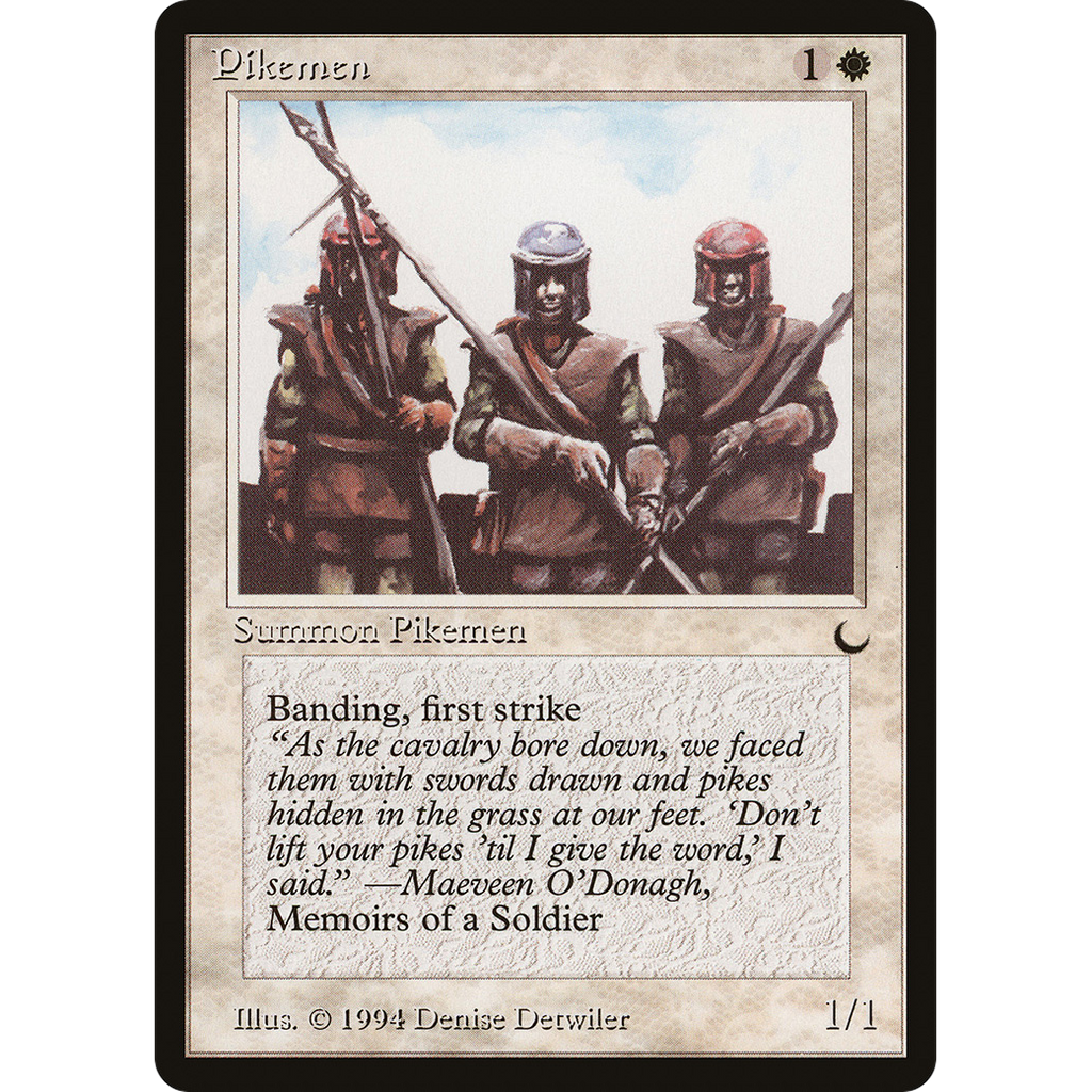 First strike; banding (Any creatures with banding, and up to one without, can attack in a band. Bands are blocked as a group. If any creatures with banding you control are blocking or being blocked by a creature, you divide that creature's combat damage, not its controller, among any of the creatures it's being blocked by or is blocking.)