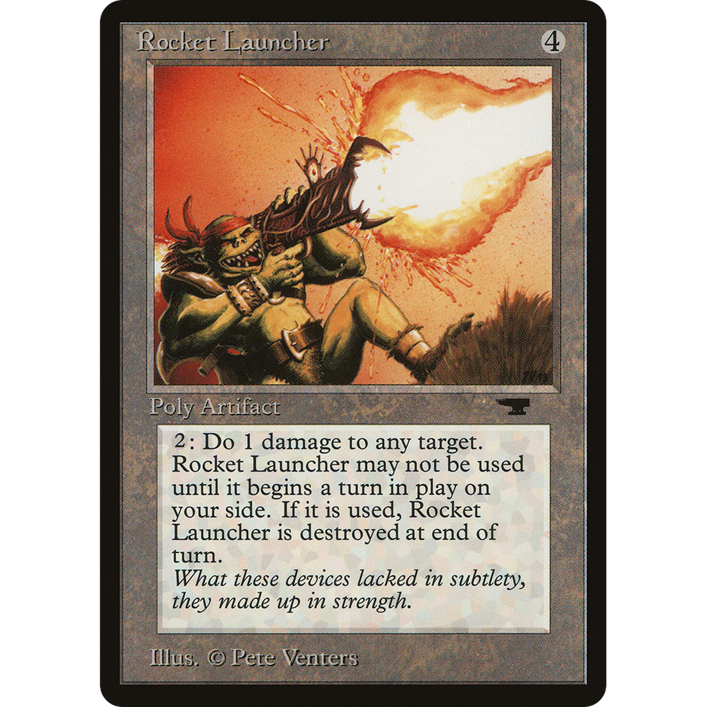 Card Text: Rocket Launcher deals 1 damage to any target. Destroy Rocket Launcher at the beginning of the next end step. Activate only if you've controlled Rocket Launcher continuously since the beginning of your most recent turn.