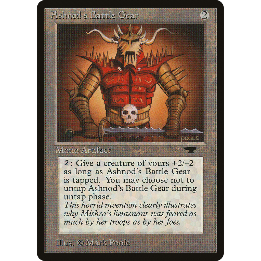 : Target creature you control gets +2/-2 for as long as Ashnod's Battle Gear remains tapped.