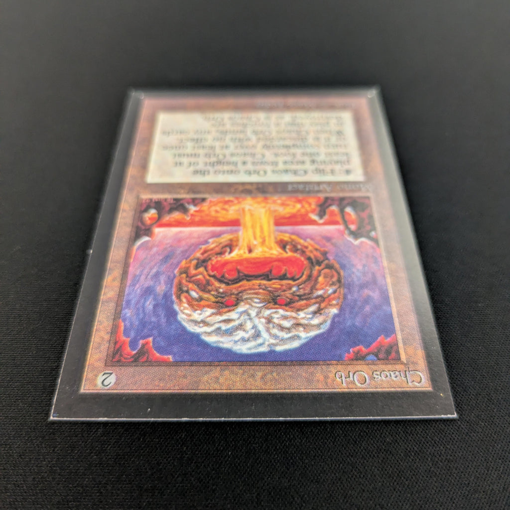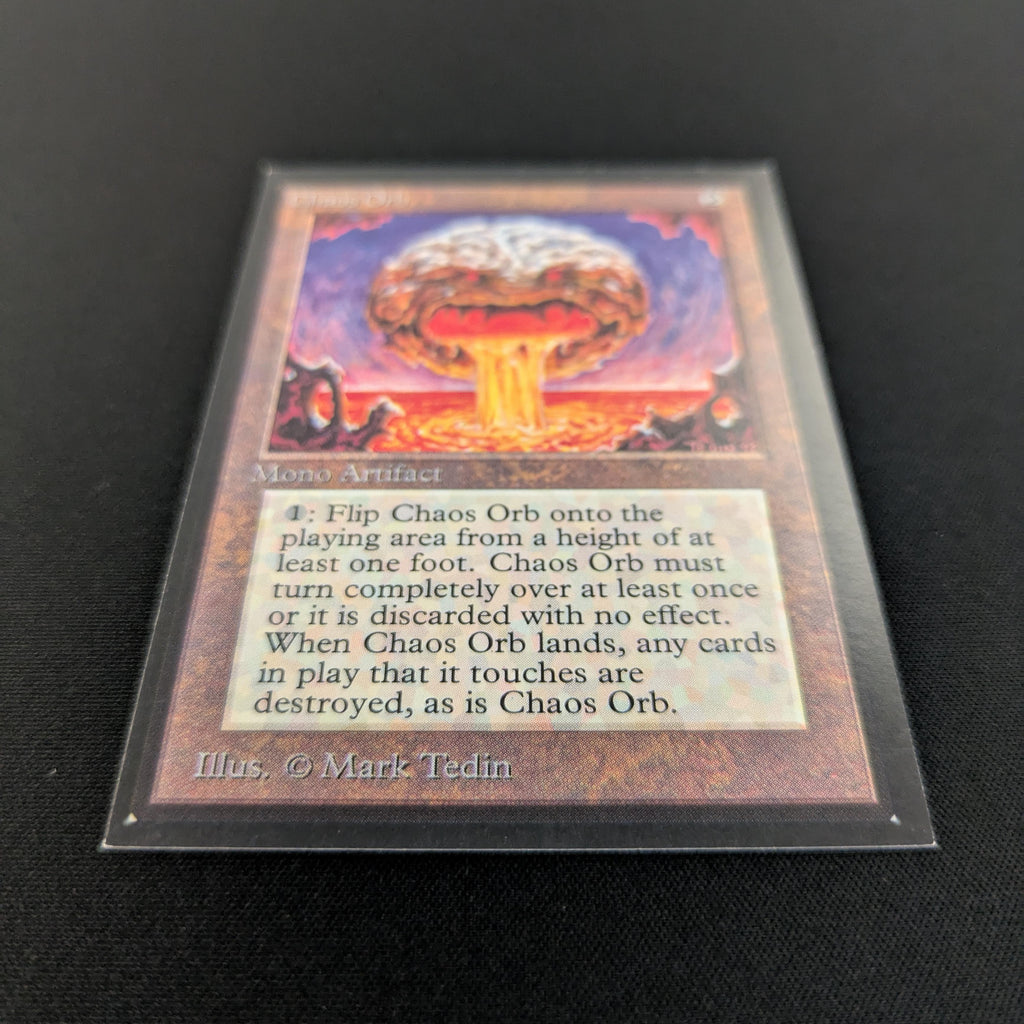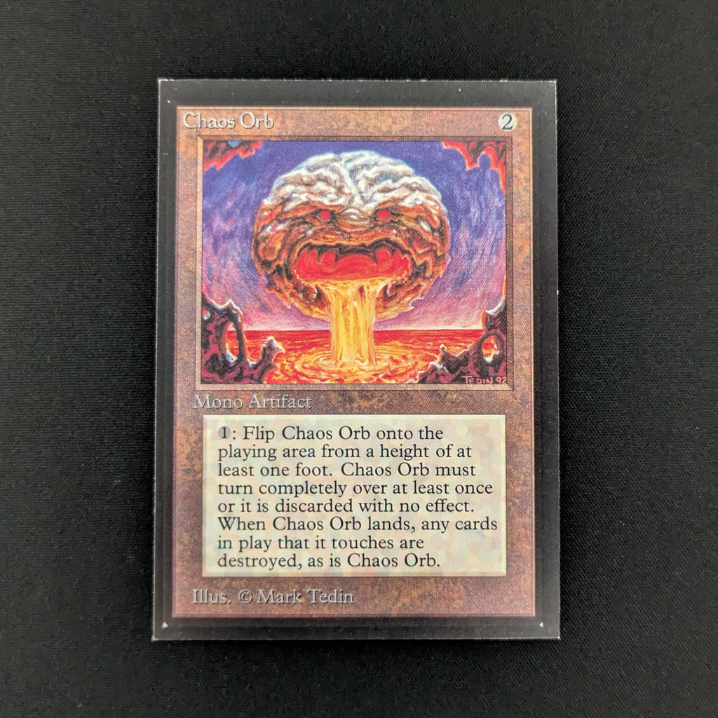 : If Chaos Orb is on the battlefield, flip Chaos Orb onto the battlefield from a height of at least one foot. If Chaos Orb turns over completely at least once during the flip, destroy all nontoken permanents it touches. Then destroy Chaos Orb.