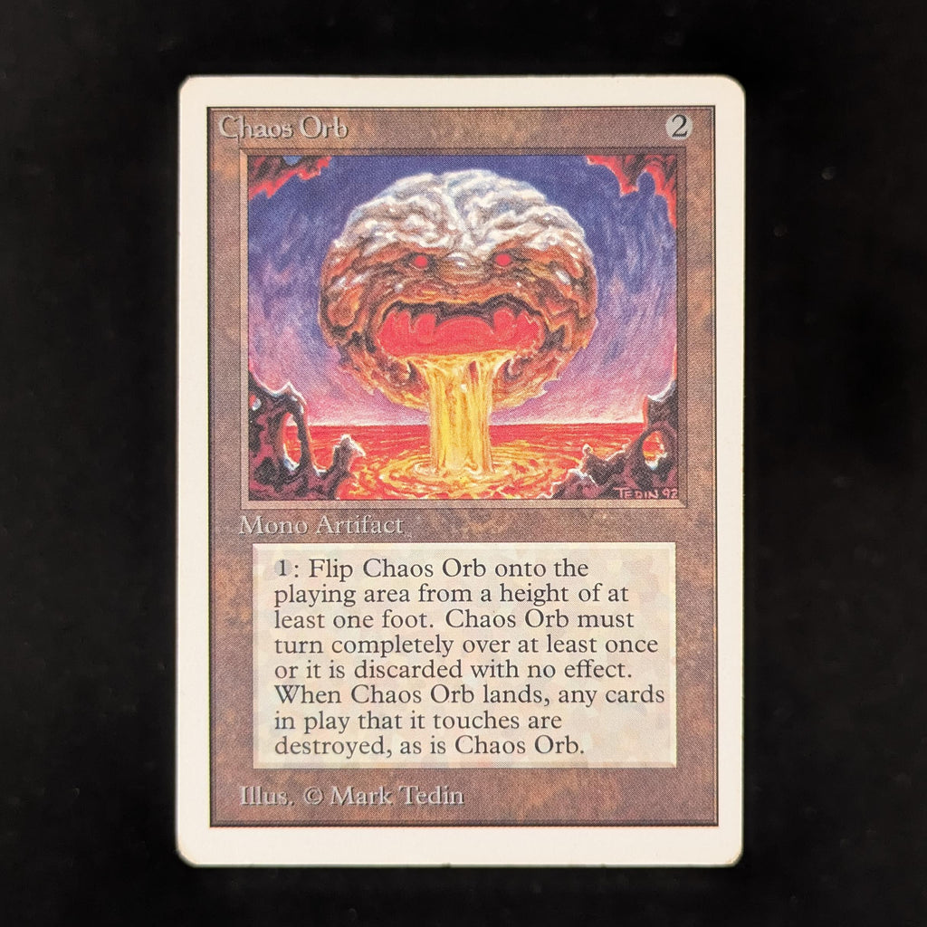 : If Chaos Orb is on the battlefield, flip Chaos Orb onto the battlefield from a height of at least one foot. If Chaos Orb turns over completely at least once during the flip, destroy all nontoken permanents it touches. Then destroy Chaos Orb.