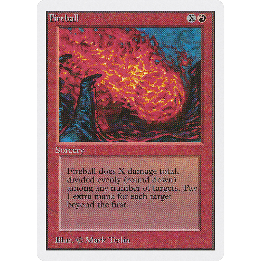 Fireball deals X damage divided evenly, rounded down, among any number of targets.