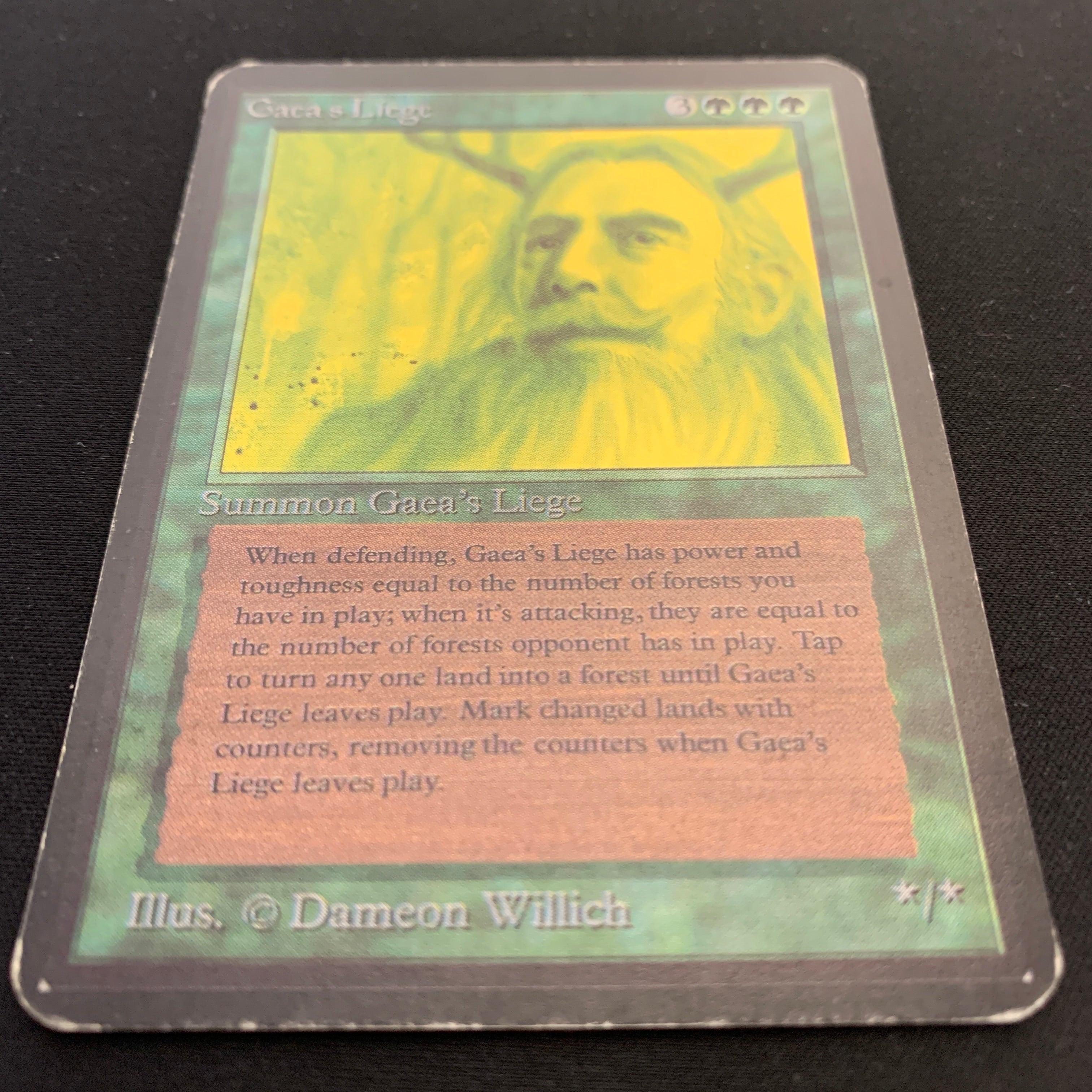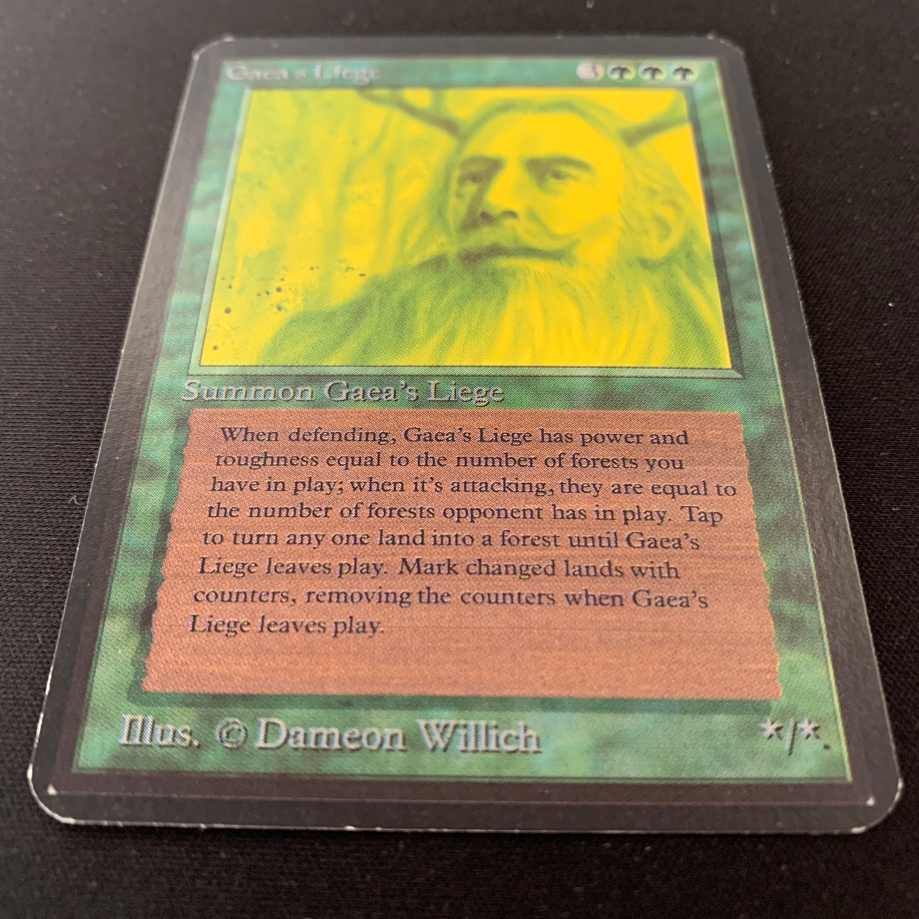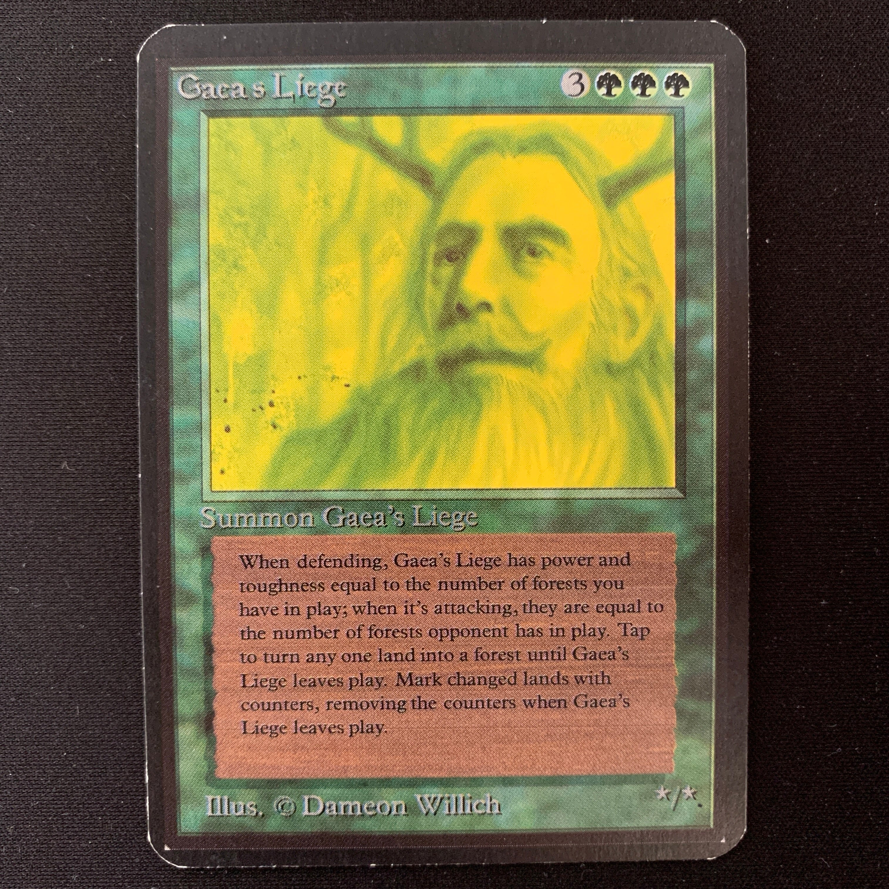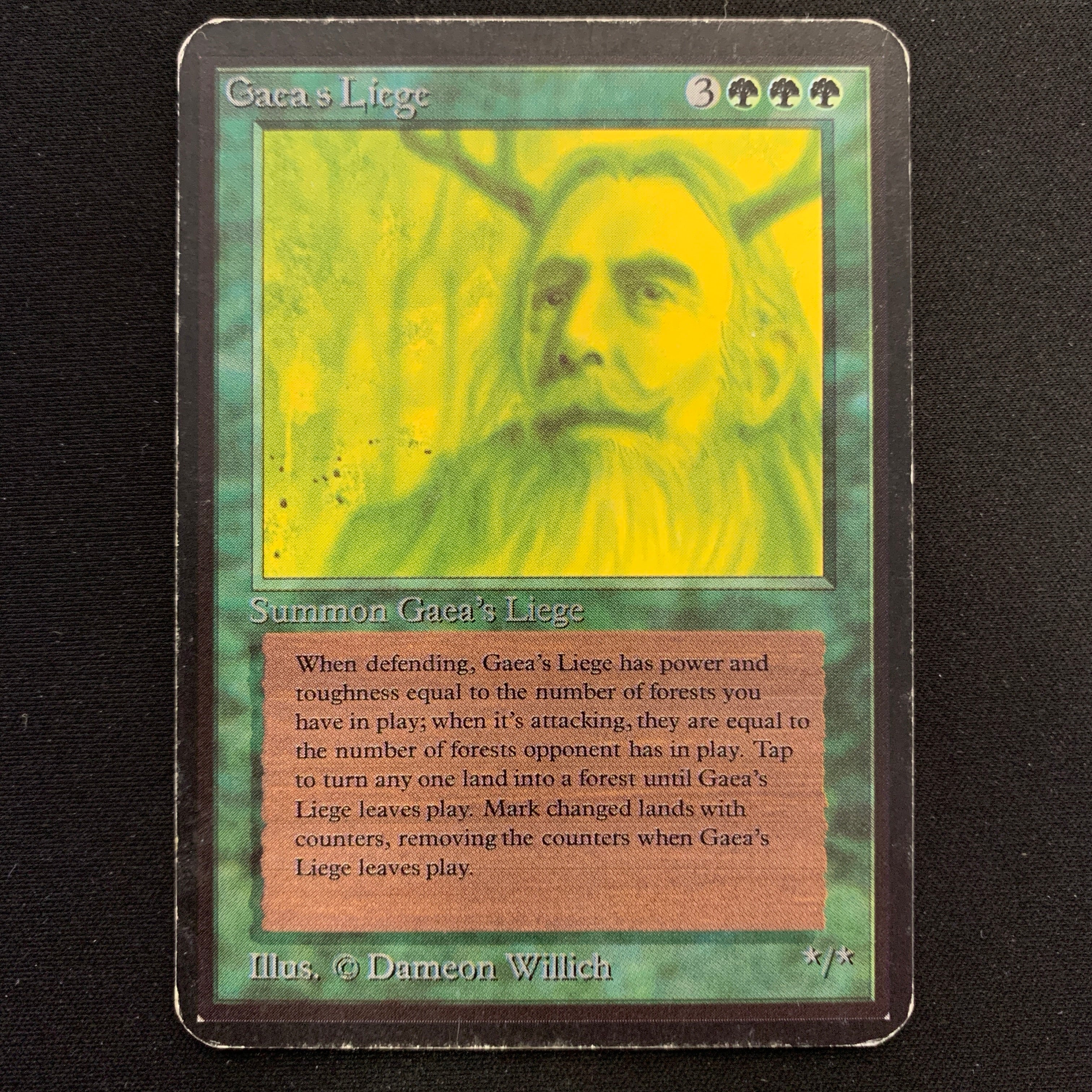 As long as Gaea's Liege isn't attacking, its power and toughness are each equal to the number of Forests you control. As long as Gaea's Liege is attacking, its power and toughness are each equal to the number of Forests defending player controls.: Target land becomes a Forest until Gaea's Liege leaves the battlefield.