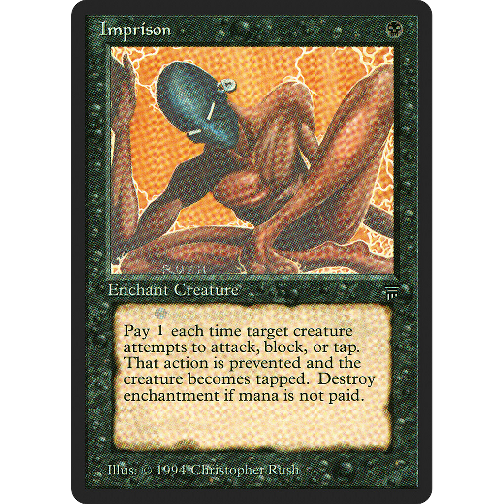 Whenever enchanted creature attacks or blocks, you may pay . If you do, tap the creature, remove it from combat, and creatures it was blocking that had become blocked by only that creature this combat become unblocked. If you don't, destroy Imprison.