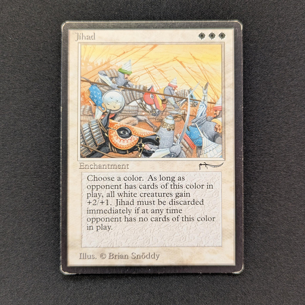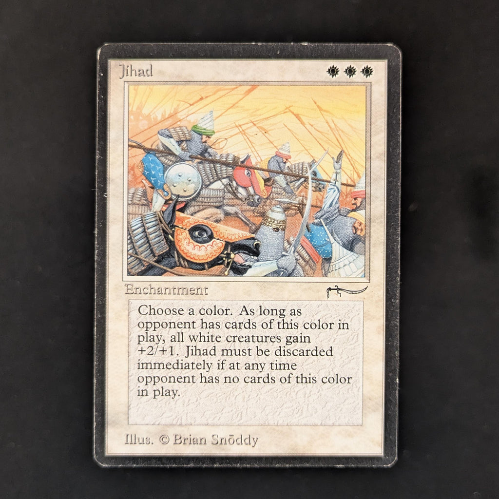 When the chosen player controls no nontoken permanents of the chosen color, sacrifice Jihad.