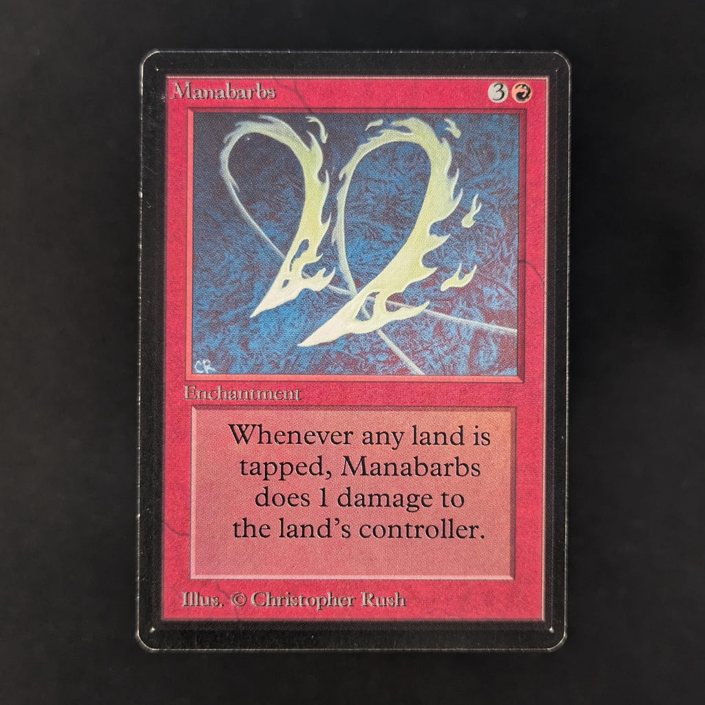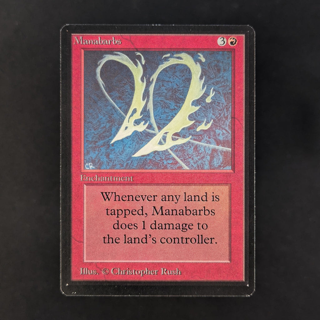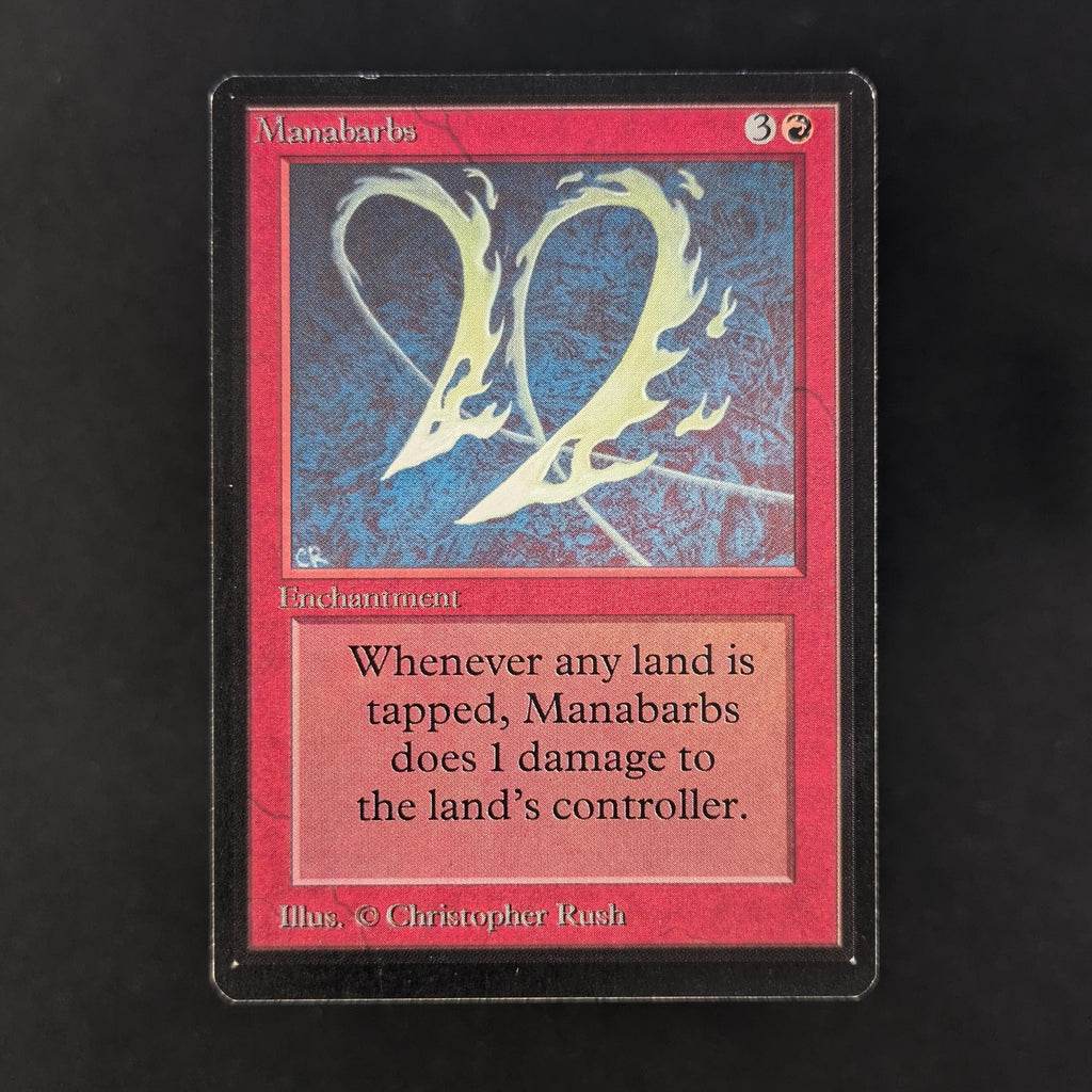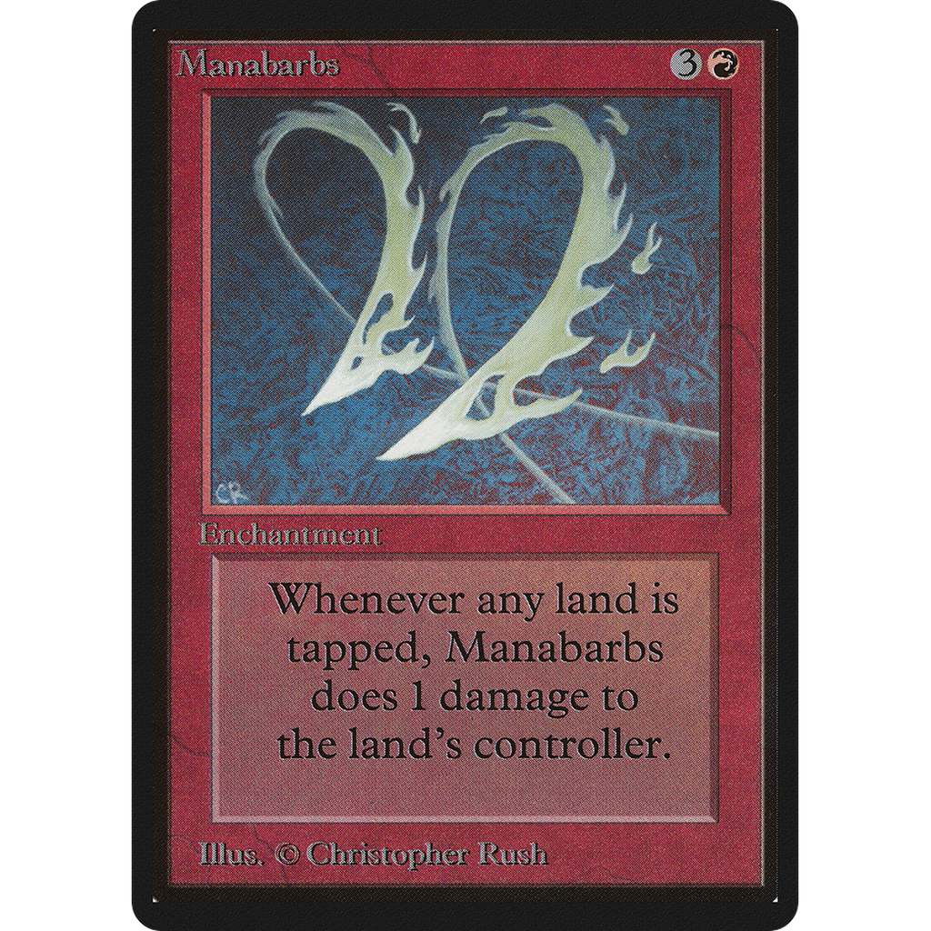 Whenever a player taps a land for mana, Manabarbs deals 1 damage to that player.