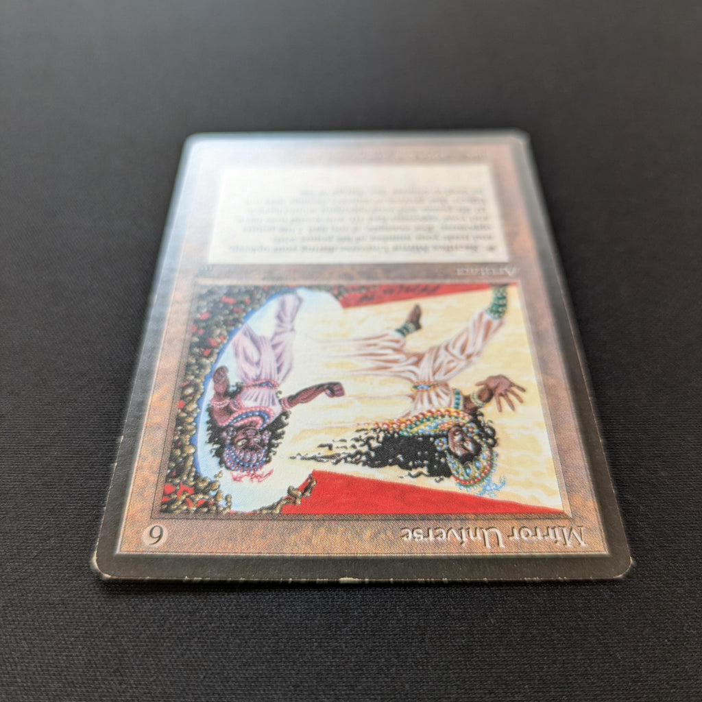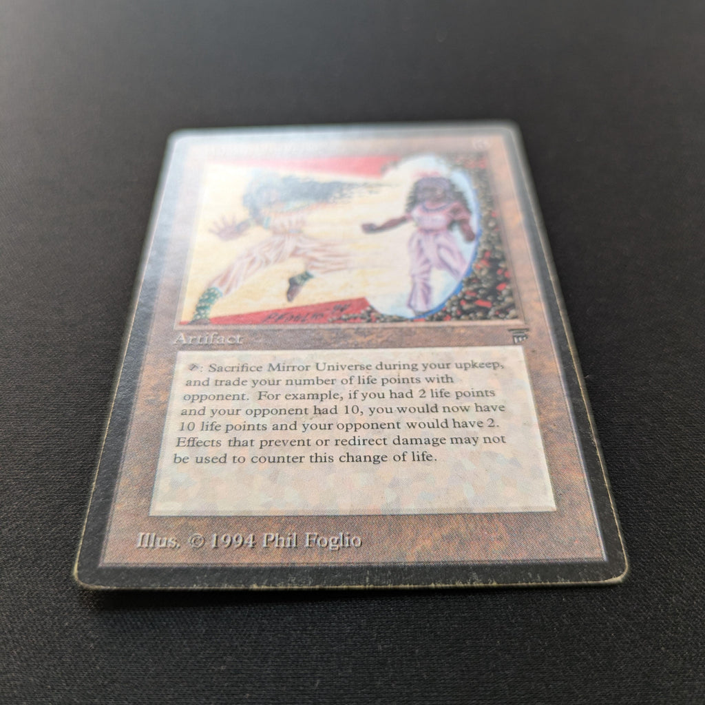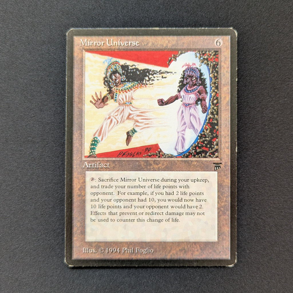 {T}, Sacrifice Mirror Universe: Exchange life totals with target opponent. Activate only during your upkeep.