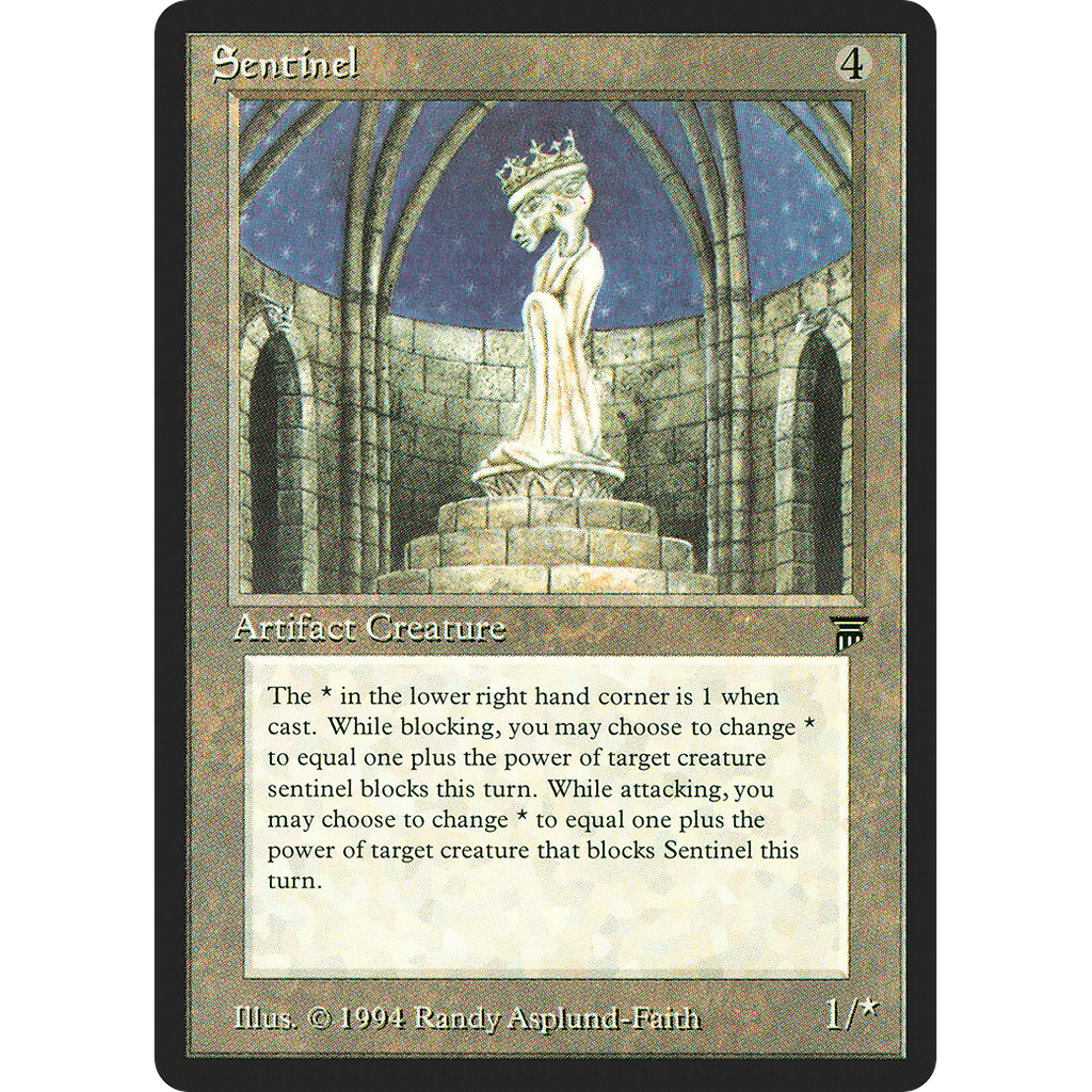 Card Text: Change Sentinel's base toughness to 1 plus the power of target creature blocking or blocked by Sentinel. (This effect lasts indefinitely.)
