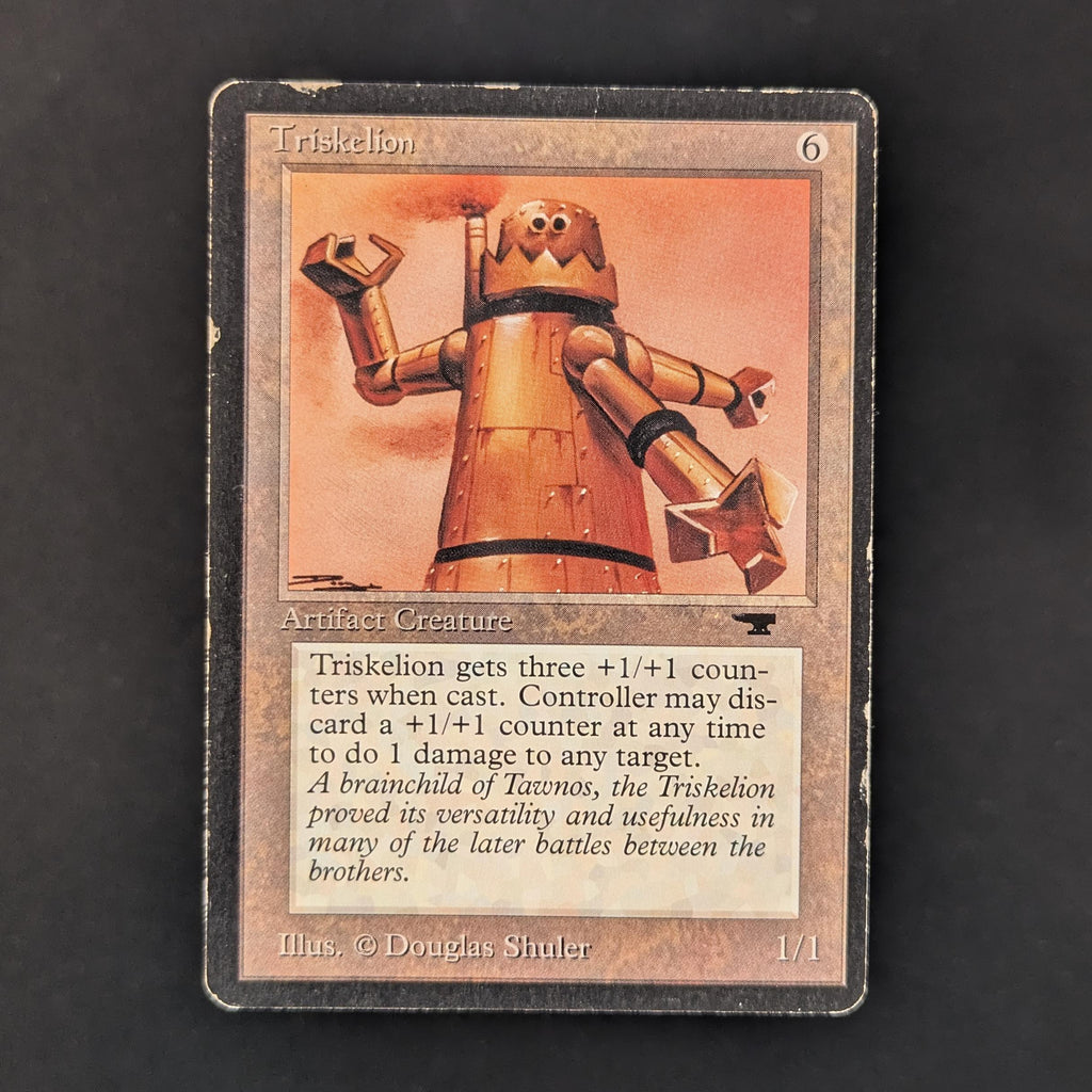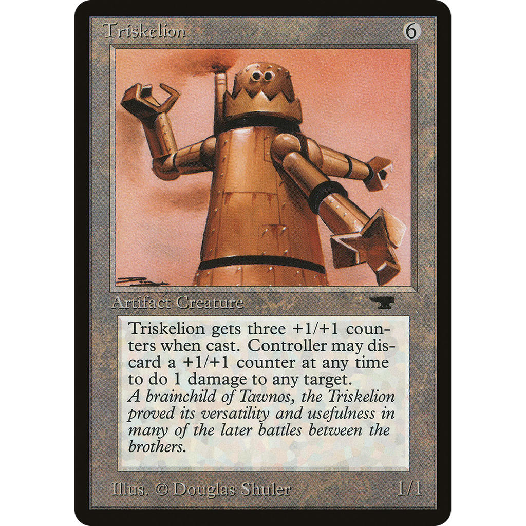 Triskelion enters the battlefield with three +1/+1 counters on it.\nRemove a +1/+1 counter from Triskelion: It deals 1 damage to any target.