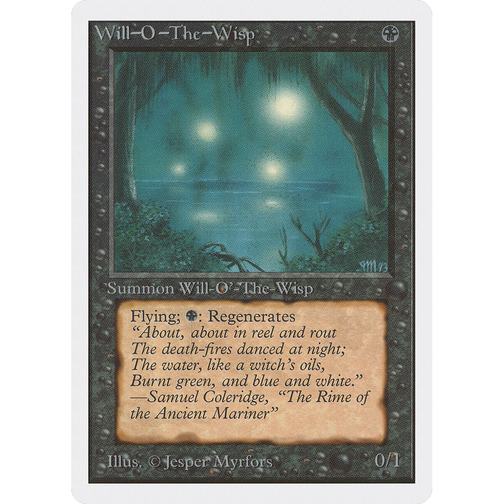 Flying (This creature can't be blocked except by creatures with flying or reach.): Regenerate Will-o'-the-Wisp. (The next time this creature would be destroyed this turn, it isn't. Instead tap it, remove all damage from it, and remove it from combat.)