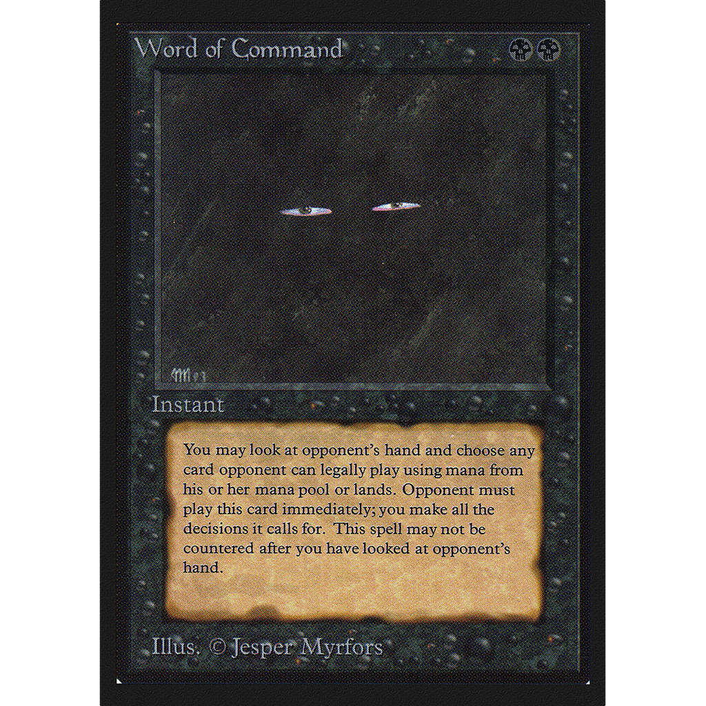 Look at target opponent's hand and choose a card from it. You control that player until Word of Command finishes resolving. The player plays that card if able. While doing so, the player can activate mana abilities only if they're from lands that player controls and only if mana they produce is spent to activate other mana abilities of lands the player controls and/or to play that card. If the chosen card is cast as a spell, you control the player while that spell is resolving.